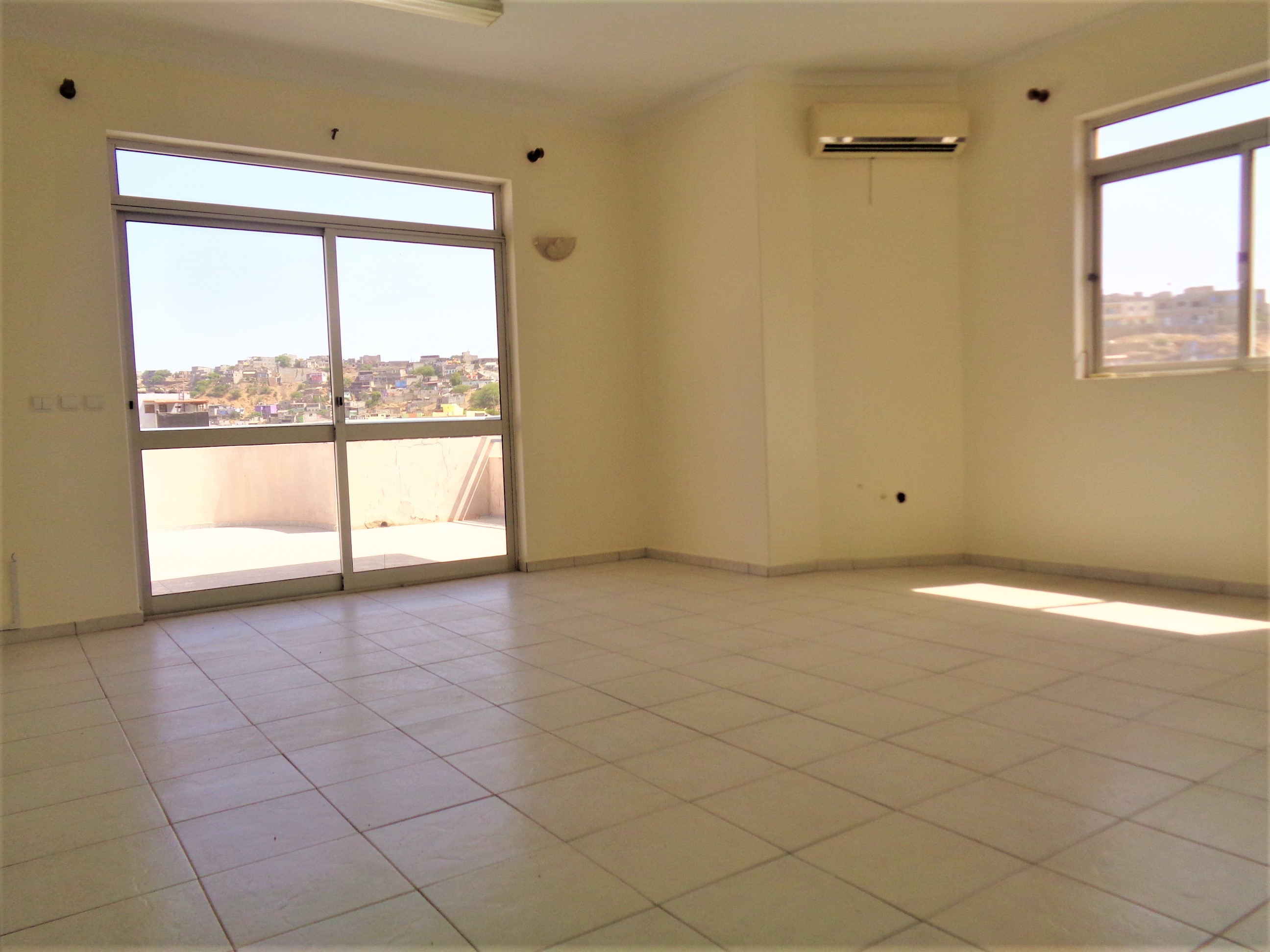 Arrenda-se Apartamento t3 no piso recuado no 3º andar esquerdo do prédio, com 121.67 m² composto por: Uma sala ampla com ar condicionado e varanda de 47.71 m²; Cozinha com armário; Área de serviço Uma suite com roupeiro e ar condicionado; Dois quartos com roupeiro e ar condicionado; Uma casa de banho. O.B.S: Todos os compartimentos tem ar condicionado Características: • AC • Bancada em Pedra (Cozinha) • Exaustor • Guarda Roupa • Intercomunicador • Termoacumulador • Terraço • Varanda
